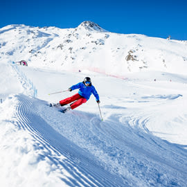 Wie vroeg begint op de Rettenbachgletsjer, krijgt rust, ruimte en verse sneeuw cadeau. De pistes liggen er strak bij, de lucht is ijl, en jij vliegt in alle stilte je eerste meters van de dag – pure vrijheid.